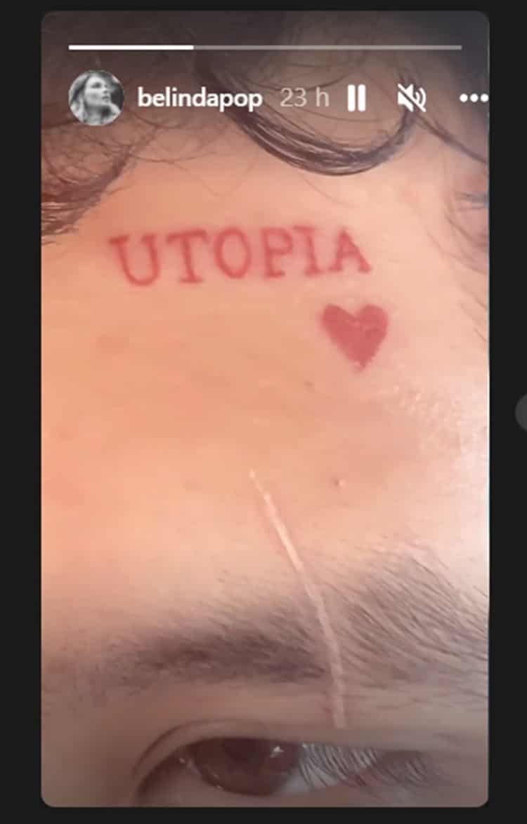Con “utopía” en letras mayúsculas y rojas, acompañadas de un corazón debajo de ellas, es como Nodal plasmó en su piel el amor que le tiene a la cantante.