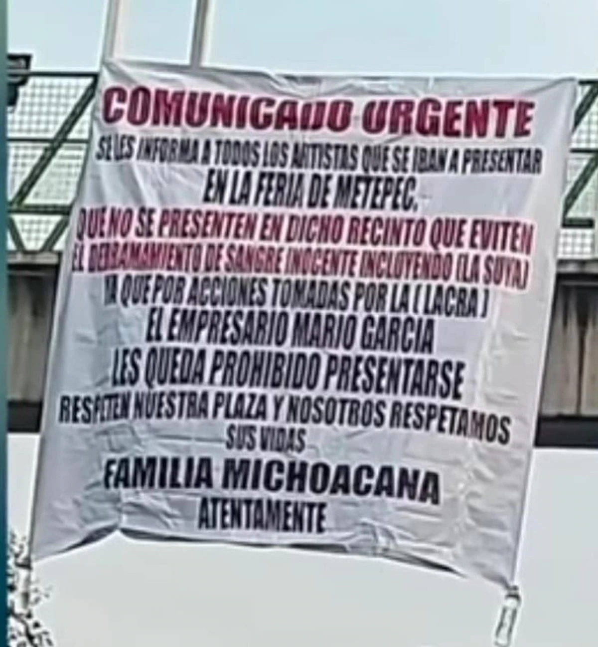 En el mensaje se advertía que por desacuerdos de La Familia Michoacana con un supuesto organizador la Feria de Metepec, los asistentes al recinto corrían peligro.