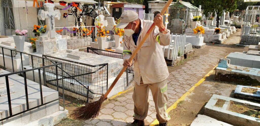A través de trabajos coordinados entre las 10 Direcciones Territoriales, la Dirección de Servicios Urbanos, y personal del área de panteones del gobierno de la alcaldía, los 11 panteones fueron intervenidos con barrido de 3 mil 800 metros, retiro de 39.2 toneladas de basura y 122 m3 de cascajo, así como poda de 41 m3 de áreas verdes.