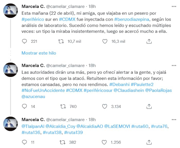 “Esta mañana (22 de abril), mi amiga, que viajaba en un pesero por #periférico sur en #CDMX fue inyectada con benzodiazepina, según los análisis de laboratorio. Sucedió como hemos leído y escuchado múltiples veces: un tipo la miraba insistentemente, luego se acercó mucho a ella”, dijo.
