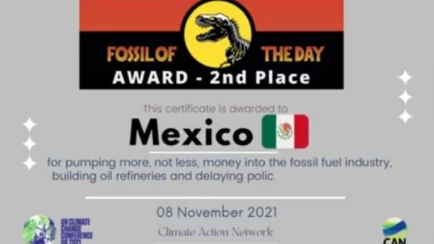La Red de Acción Climática (CAN, por su sigla en inglés), una red global de más de mil 500 organizaciones sociales de 130 países, otorgaron a México el segundo lugar del premio “Fósil del Día”.