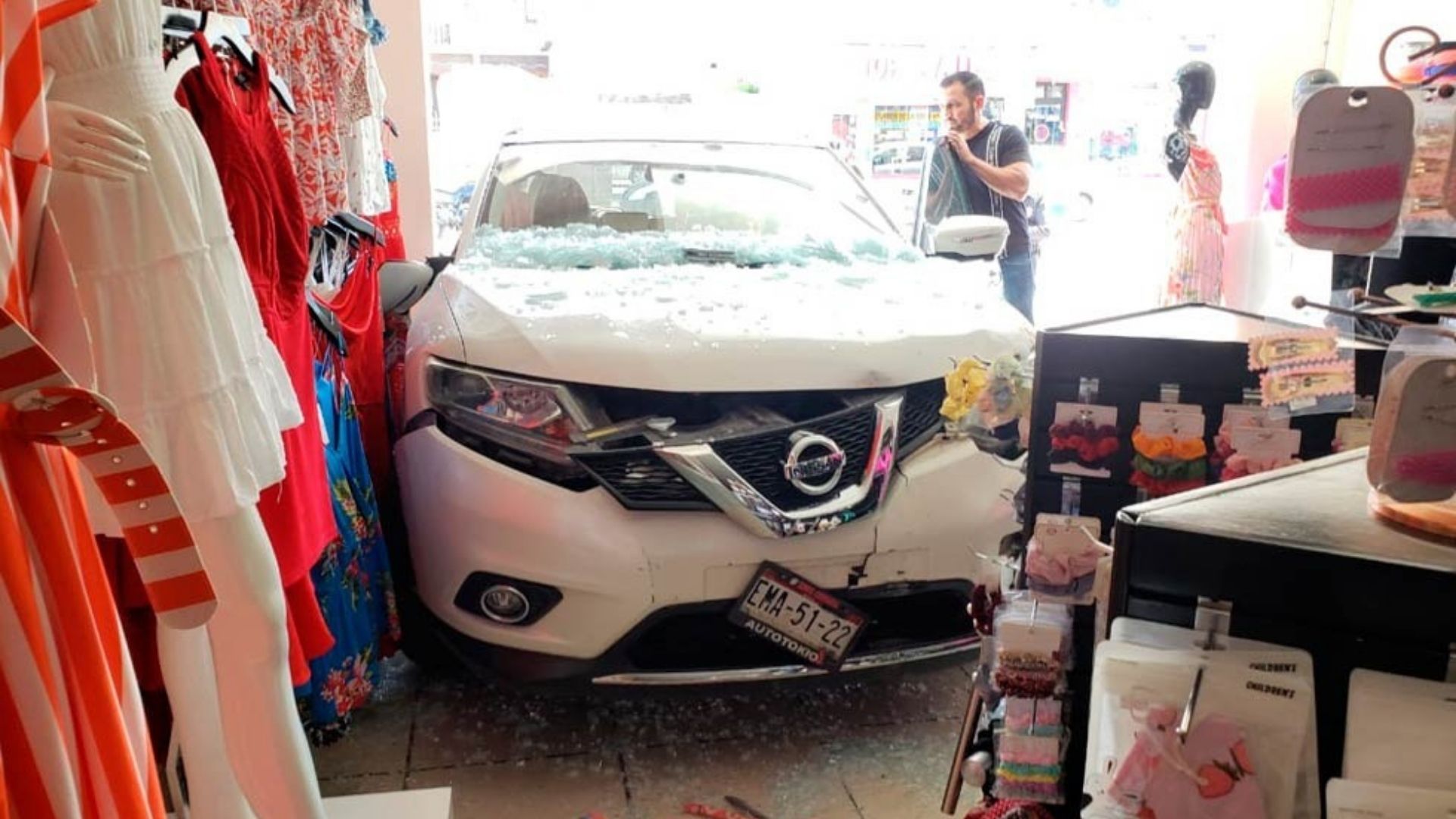 Chihuahua.- Un accidente vial se registró durante la mañana de este domingo en donde la conductora de una camioneta de un modelo nuevo confundió el pedal del freno por el acelerador y terminó por quedar dentro de un negocio ubicado en pleno centro de la ciudad.