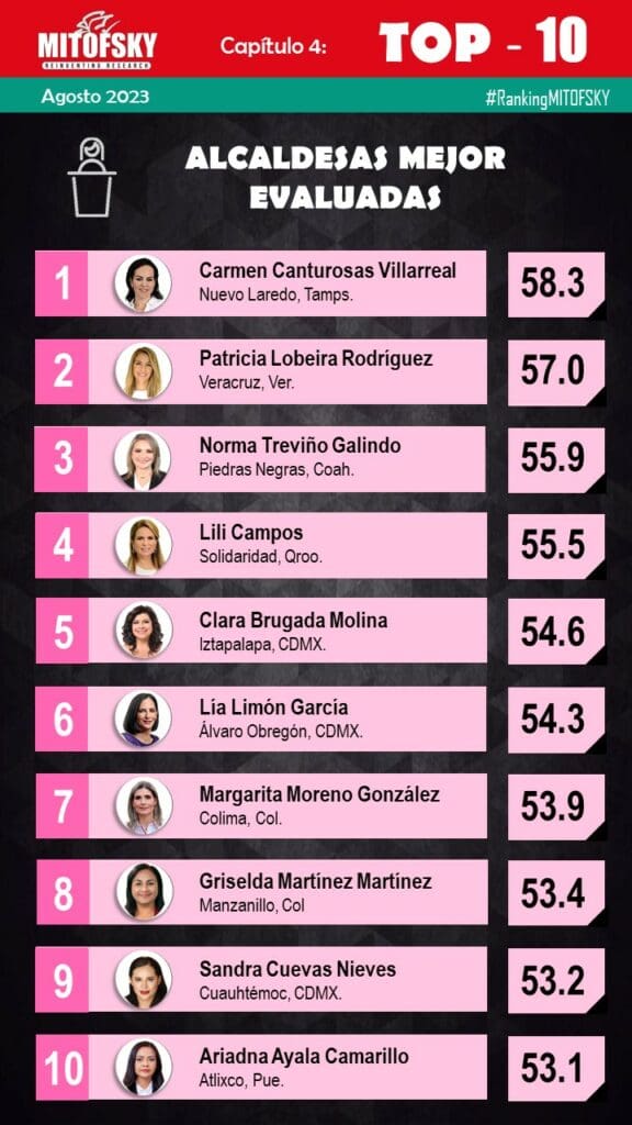 Por ejemplo, en el ranking de Consulta Mitofsky del mes de agosto del presente año, Lili Campos está ubicada como la cuarta mejor alcaldesa del país, después de las autoridades de Nuevo Laredo, Tamaulipas, Veracruz, Veracruz y Piedras Negras, Coahuila.