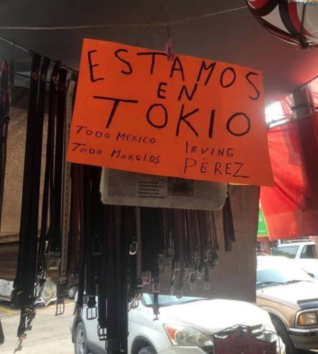 “Estamos en Tokio. Todo México. Todo Morelos. Irving Pérez” Pancarta de Hermilio Pérez.