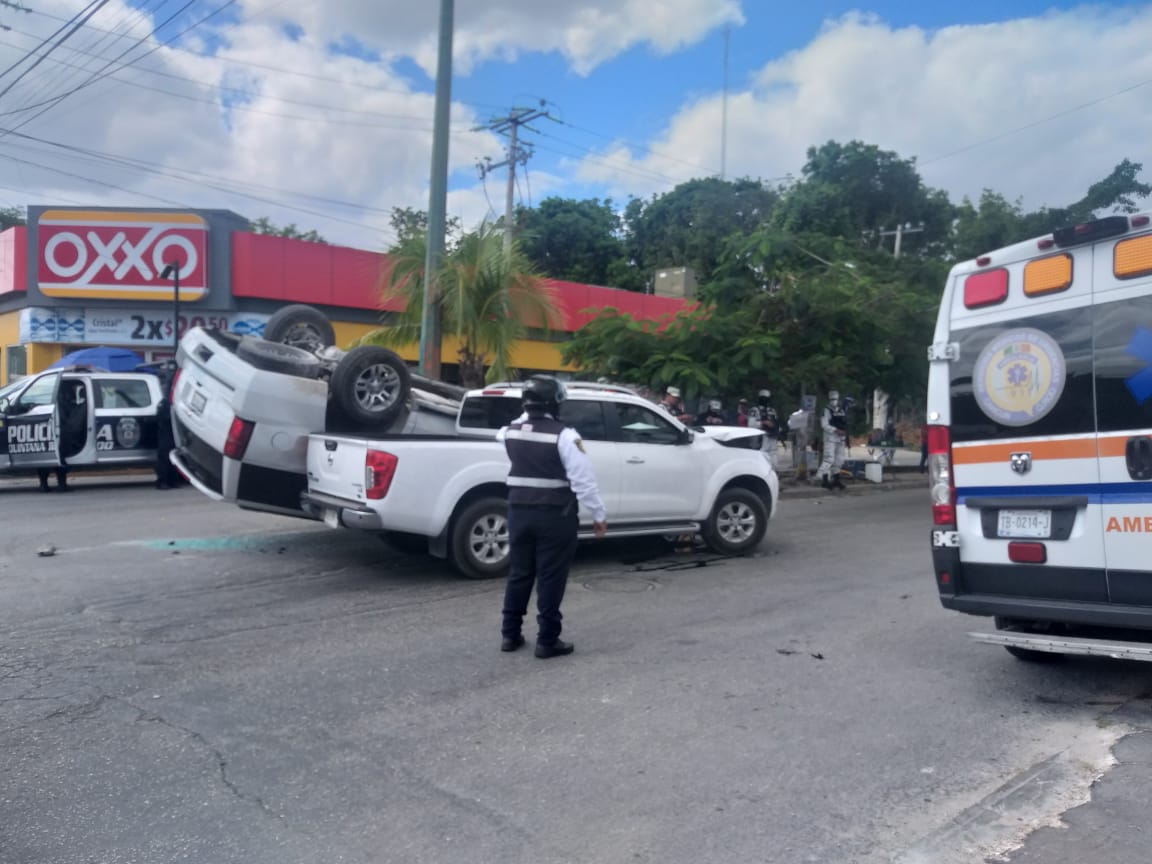 Tras el percance la lujosa camioneta Suburban terminó volcada con las llantas hacía arriba a un costado de la unidad contra la que se impactó.