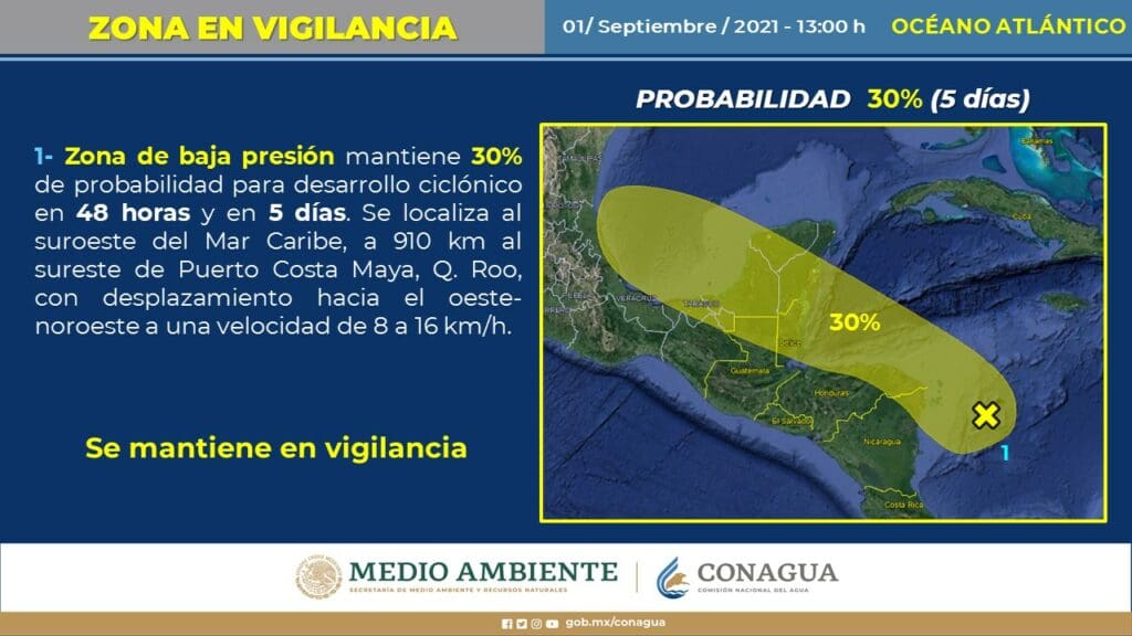 Chetumal.- La zona de baja presión en el Atlántico que se localiza a más de 900 kilómetros al sureste del Puerto Costa Maya, aumentó a 30 por ciento su probabilidad de desarrollo ciclónico en las próximas 48 horas, según el pronóstico de la Comisión Nacional del Agua (Conagua).
