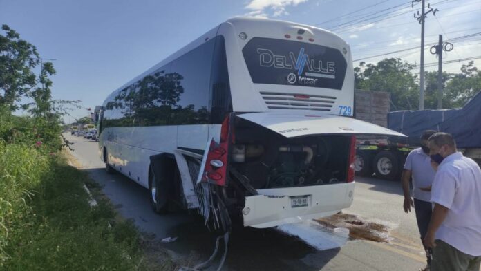 Playa del Carmen.- Un autobús de transporte privado que llevaba trabajadores de la empresa Del Valle, generó un fuerte accidente esta tarde, al incorporarse de forma temeraria a la carretera federal Cancún-Playa del Carmen, y ser chocado por una camioneta. Un adolescente sufrió lesiones menores.