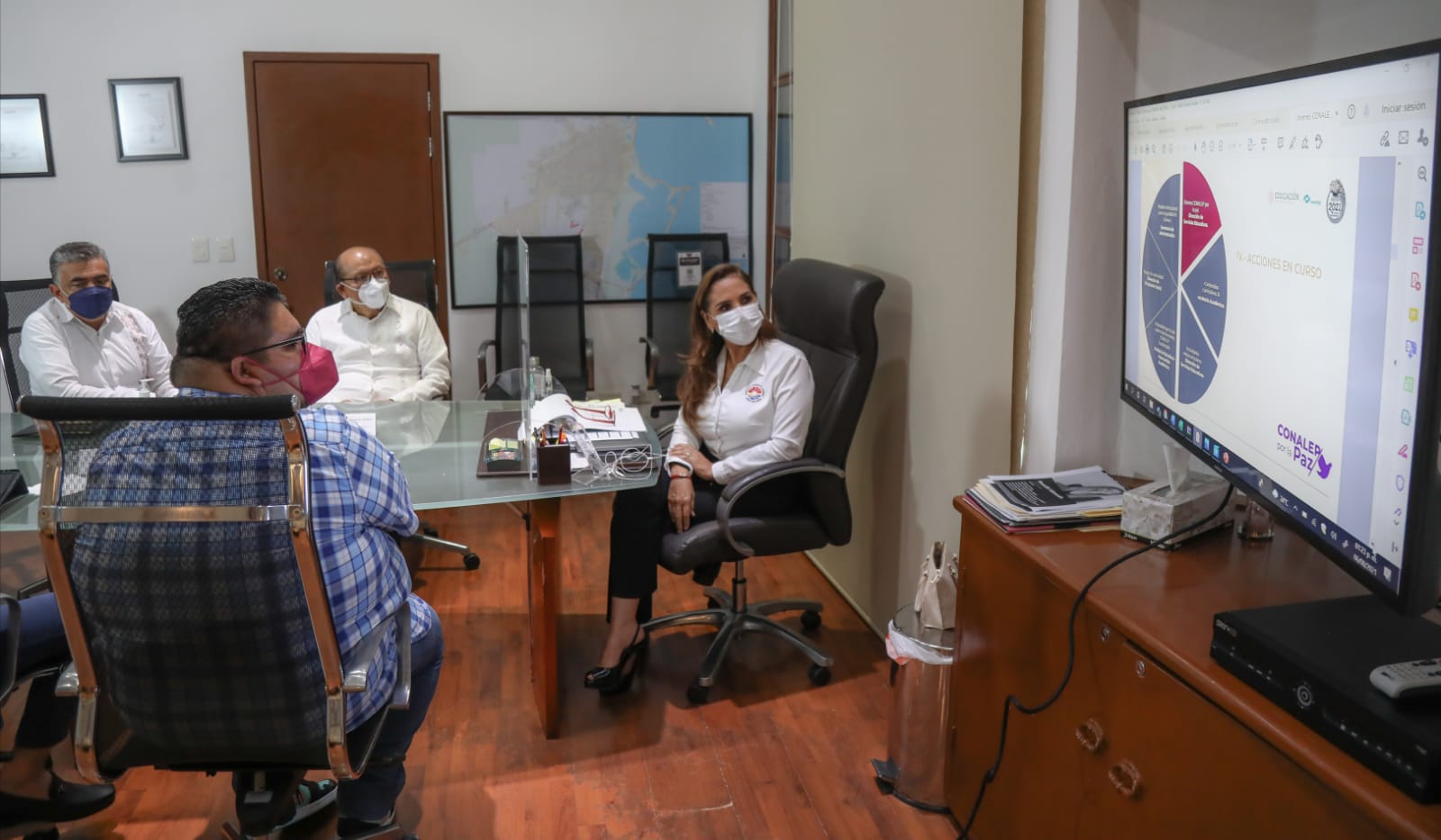 La Presidenta Municipal Mara Lezama dialogó con el director general del sistema Conalep, Enrique Ku Herrera; el secretario general, Rolando de Jesús López Saldaña; y el director general del Conalep en Quintana Roo, Aníbal José Montalvo Pérez.