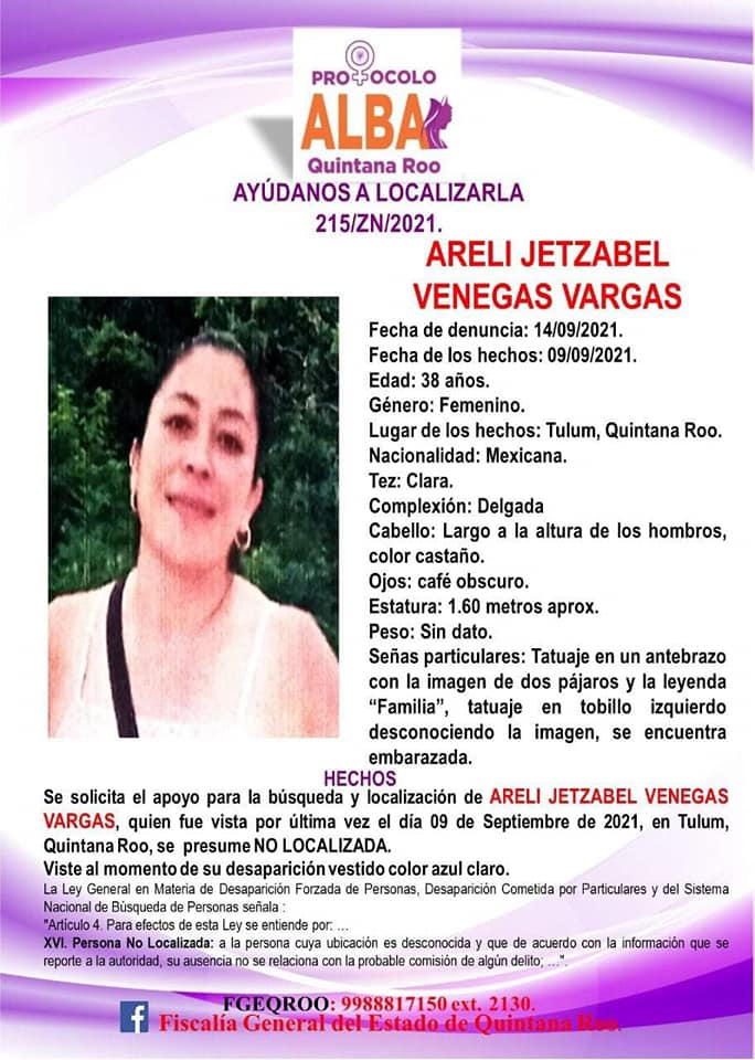 Tulum.-Amigos y familiares de Areli Jetzabel Venegas Vargas, quien tiene seis meses de embarazo buscan a esta futura madre quien acudió a control de embarazo y hasta ahora no se sabe nada de ella.