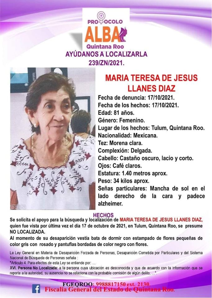 Tulum, Quintana Roo.-La familia de la señora María Teresa de Jesús Llanes Díaz, de 81 años de edad, la busca con desesperación, pues informó que desapareció el pasado 17 de octubre tras salir de su cuarto de hotel en Tulum y hasta ahora no tiene ninguna pista de su paradero.