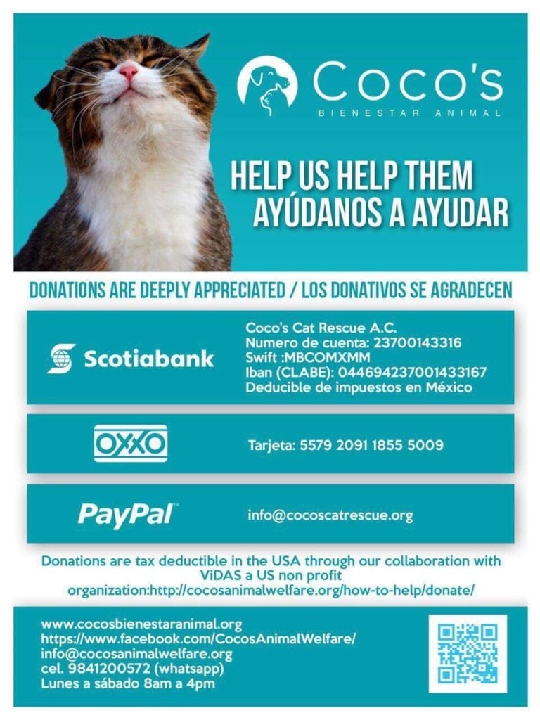 Para hacer los donativos a Coco´s Cat Rescue, A.C., se puede escribir a las redes sociales o a: info@cocoscatrescue. org. La cuenta de esta ONG es: Scotiabank 23700143316 , Iban (CLABE): 044694237001433167; OXXO: Scotiabank 5579209118555009. Abajo la imagen.