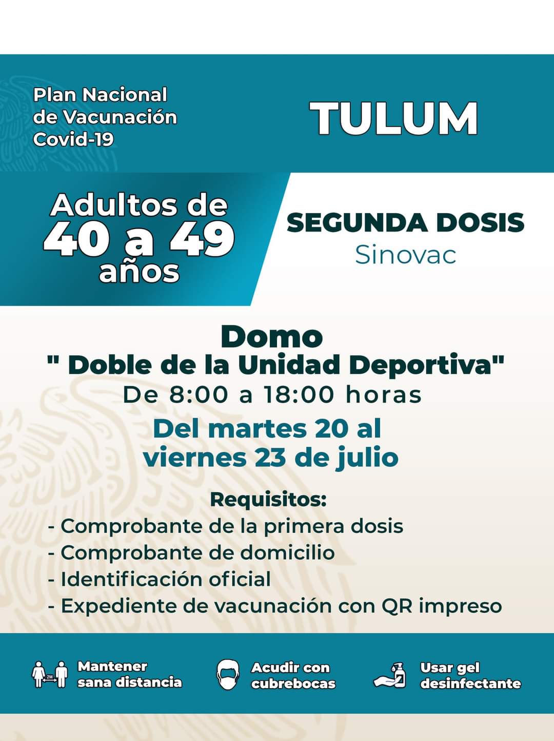 Tulum.- Del martes 20 al viernes 23 de julio, se llevará a cabo la aplicación de segundas dosis de la vacuna Sinovac para adultos de 40 a 49 años en el municipio de Tulum.