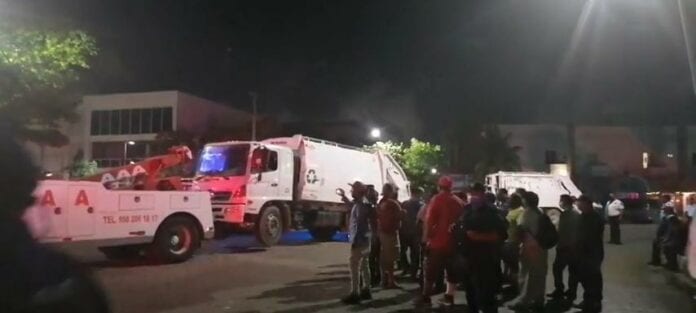 Más de 80 trabajadores de la empresa mantuvieron bloqueada la glorieta Historia de México, en la Tulum con Uxmal, para exigir el cese de la “cacería” de Tránsito en su contra, luego que fueran retenidos tres camiones de recolección de basura, por no portar placas.