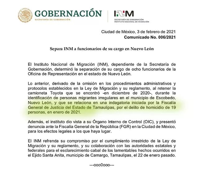 Por tal motivo los funcionarios quedan removidos de sus puestos, derivado de la omisión en los procedimientos administrativos y protocolos establecidos en la Ley de Migración y su reglamento, al retener la camioneta Toyota que se encontró en el mes de diciembre de 2020, durante la identificación de personas migrantes irregulares en el municipio de Escobedo, Nuevo León”, indica el comunicado.