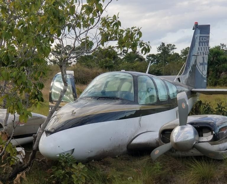 Es un avión blanco con negro, el cual tenía dañadas sus ruedas, alas y hélices, y a pesar de que se inspeccionó no fue localizado algún cargamento de droga, pero si huellas de autos en los alrededores. La matrícula del avión es YV-124, visiblemente alterados.