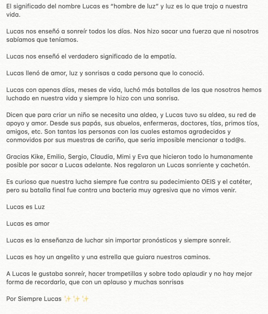 “El significado del nombre Lucas es hombre de luz y luz es lo que trajo a nuestra vida. Lucas nos enseñó a sonreír todos los días. Nos hizo sacar una fuerza que ni sabíamos que teníamos. Lucas nos enseñço el verdadero significado de la empatía. lucas llenó de amor, luz y sonrisas a cada persona que lo conoció”, dice una parte de comunicado publicado por el periodista e influencer.