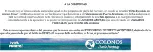 “El pasado viernes 7 de agosto se llevó a cabo la audiencia penal correspondiente a la denuncia que la Asociación de Colonos interpuso en contra del Fideicomiso Puerto Aventuras por el delito de despojo”, expusieron, “En esta audiencia el juez resolvió a favor del Fideicomiso argumentando que ellos tenían el derecho de recuperar la caseta, sin embargo, el juez nunca tomó en cuenta el modo violento en el que la caseta fue recuperada y otros puntos importantes”.