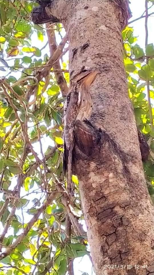 El usuario compartió que durante el día solo puede verse por casualidad y generalmente permanece erguida sobre una rama quebrada en la parte superior de los árboles, en la que permanece inmóvil con el pico apuntando hacia arriba. “La coloración del plumaje es tal, que es asombrosamente similar al colorido de la corteza de la rama, y el ave posada parece la continuación de la misma”, quizás por ese camuflaje se le conoce como “fantasma”.