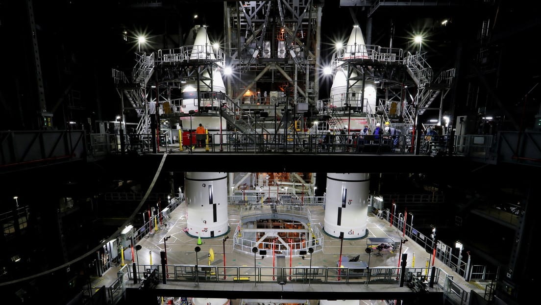 Durante el viernes y el sábado, los equipos del Centro Espacial Kennedy utilizaron una grúa especializada para levantar la etapa central. Colocarla en posición vertical y luego bajarla hasta su lugar entre los SRB, en el así llamado lanzador móvil. Se trata esta de una estructura que sirve como plataforma, pero también como proveedor clave de energía, comunicaciones, refrigerantes y propulsor para el cohete y la nave espacial antes del lanzamiento.