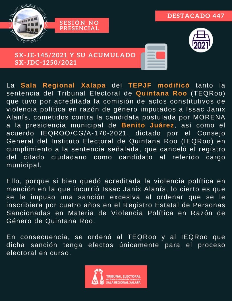 El Tribunal Electoral del Poder Judicial de la Federación (TEPJF) sala regional Xalapa, Veracruz, modificó la sentencia del Teqroo (Tribunal Electoral de Quintana Roo) en contra de Issac Jánix Alanís, por violencia política de género contra la entonces candidata por Morena a la presidencia municipal de Benito Juárez, Mara Lezama.