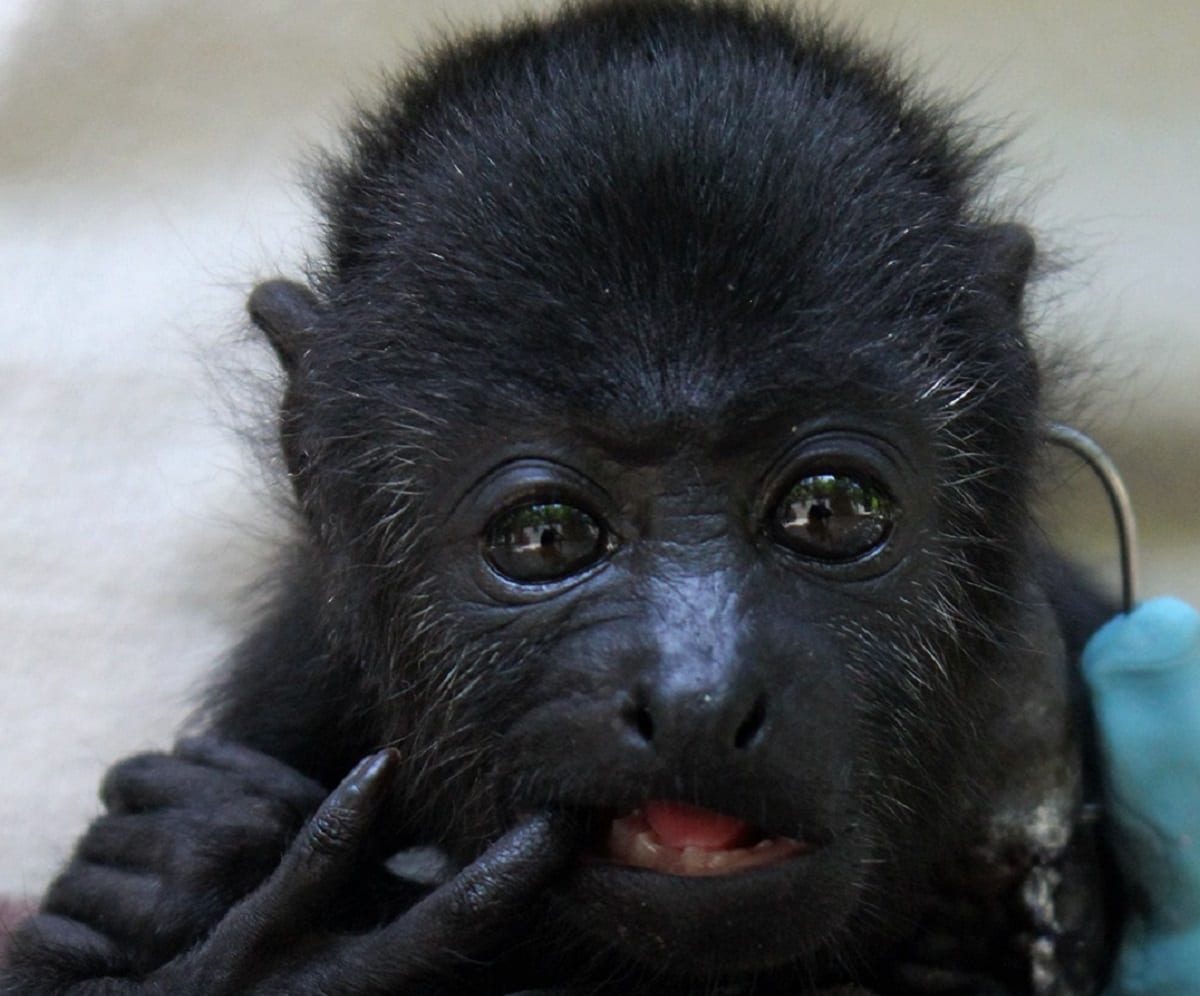 Cuando el pequeño mono aullador fue hallado el pasado 29 de abril, tenía una fractura expuesta en su brazo izquierdo la cual posiblemente sufrió cuando su mamá cayó de un árbol mientras huía de cazadores.