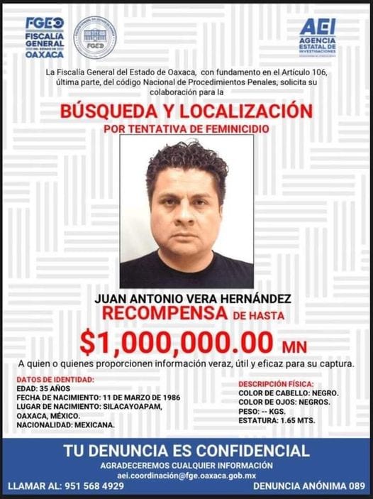 Oaxaca.-Junto a una recompensa de 1 mdp para dar con el paradero de Juan Antonio Vera Hernández, agresor de la saxofonista oaxaqueña mixteca María Elena Ríos Ortiz, finalmente las autoridades han lanzado una ficha roja.