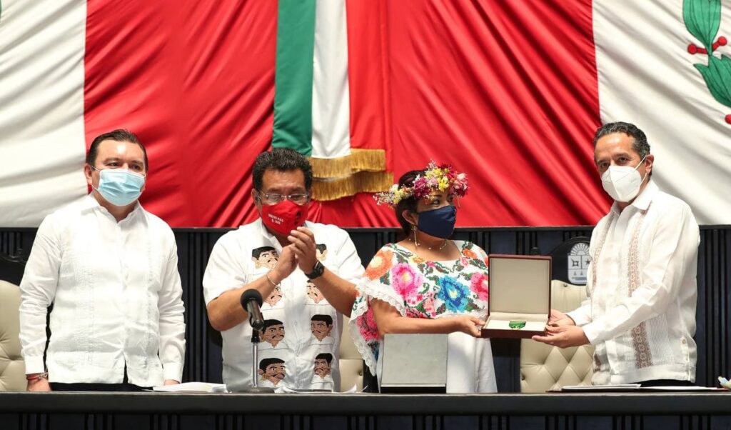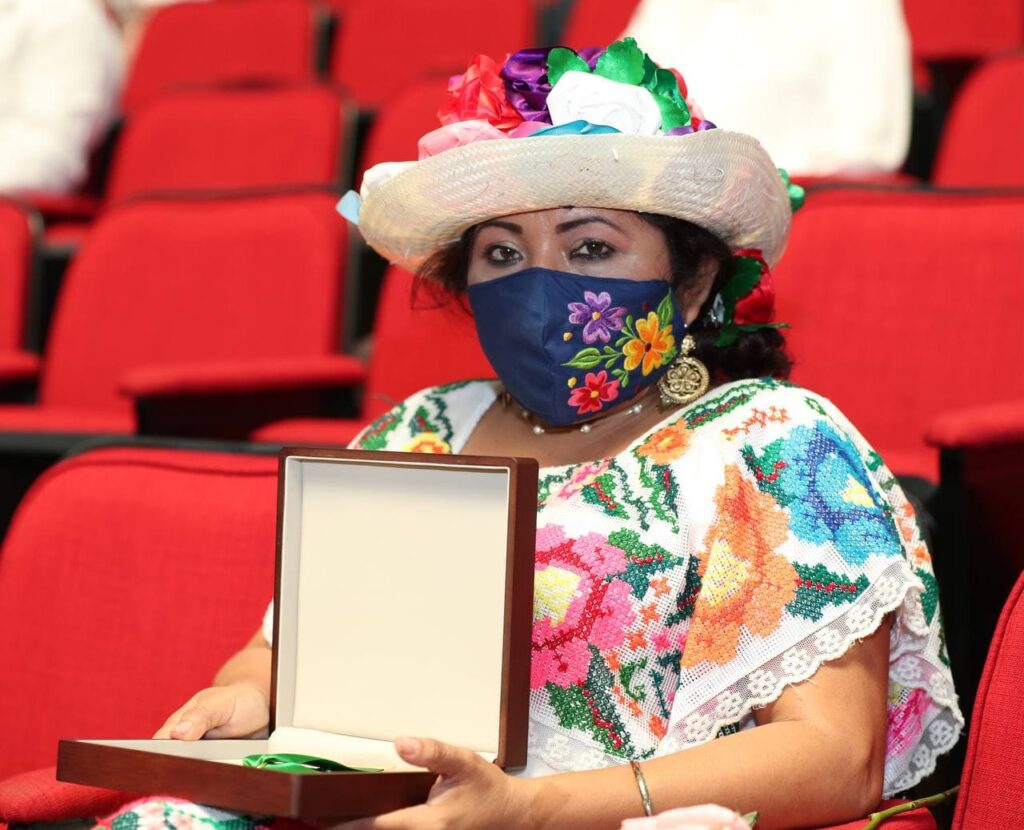 Chetumal.- Al entregar hoy la Medalla al Mérito Indígena Maya “Cecilio Chí” a la promotora cultural Maritza del Carmen Yeh Chan, el gobernador Carlos Joaquín expresó que representa el reconocimiento a nuestros ancestros, a nuestros orígenes, y a los pueblos de nuestra cultura maya.