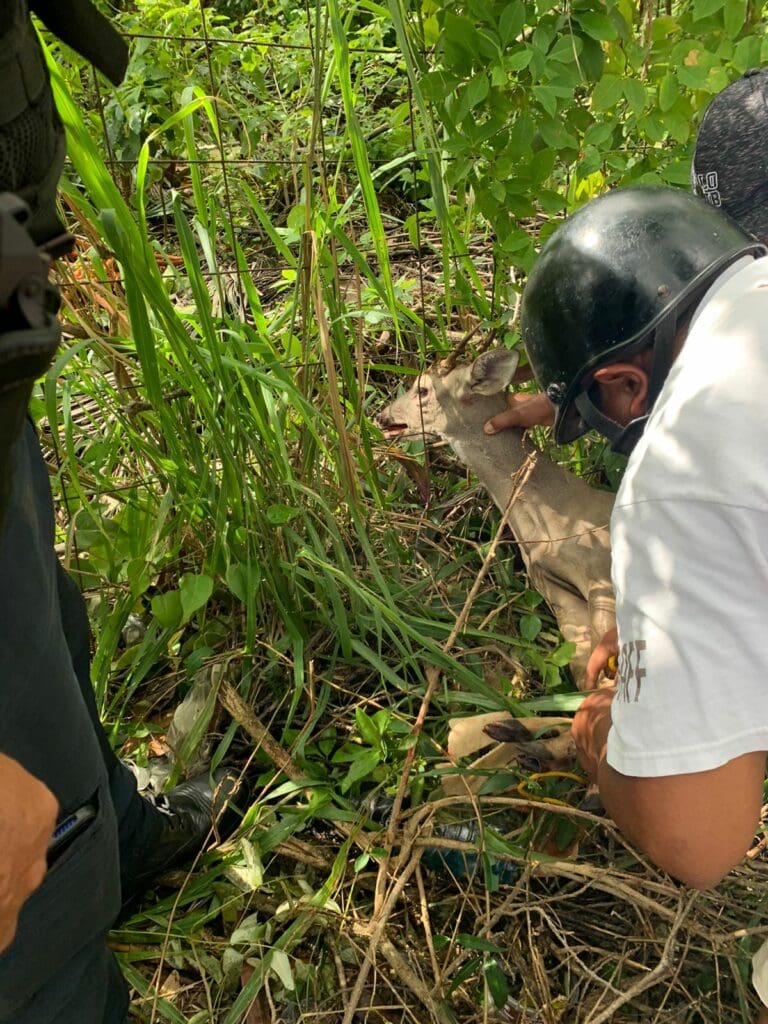Cozumel.- Un venado sé que quedó atrapado en una cerca de alambre en la colonia Independencia de esta isla y fue rescatado por personal del Ayuntamiento y ciudadanos voluntarios, quedando de inmediato en libertad.