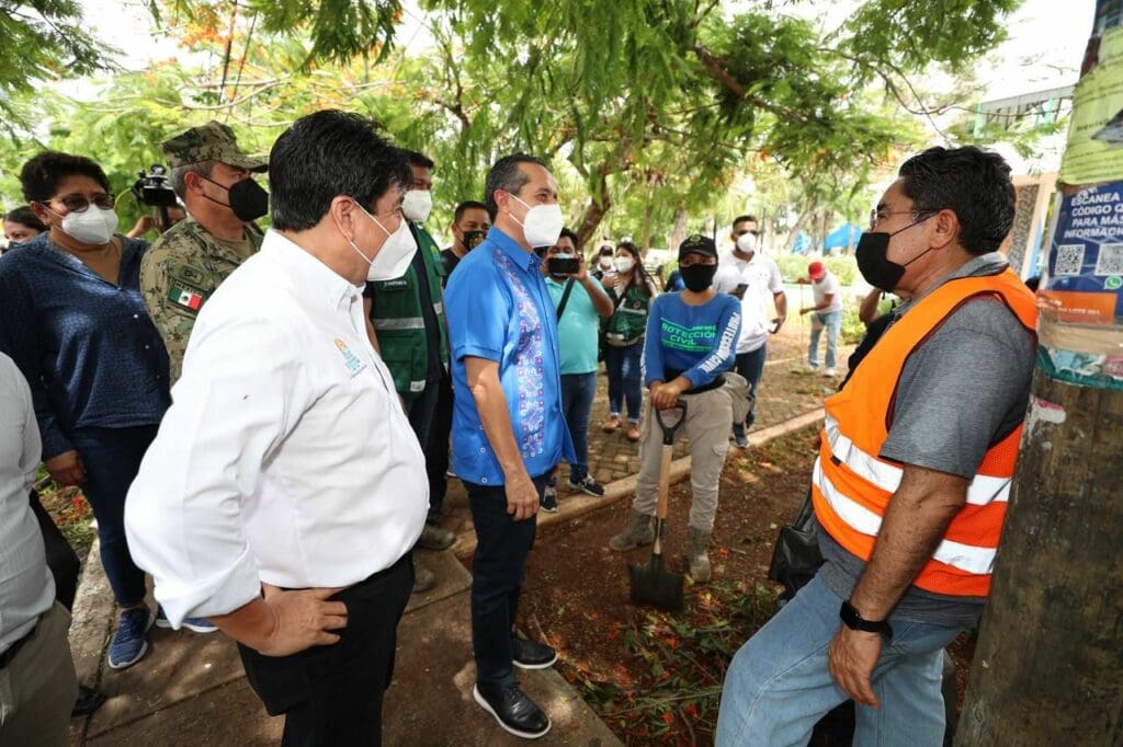 Carlos Joaquín verificó, junto con autoridades de la Marina, el presidente municipal Victor Más, y diversas autoridades, los trabajos de limpieza de las calles, camellones y banquetas que fueron invadidas por árboles y ramas que cayeron por los fuertes vientos del huracán Grace.