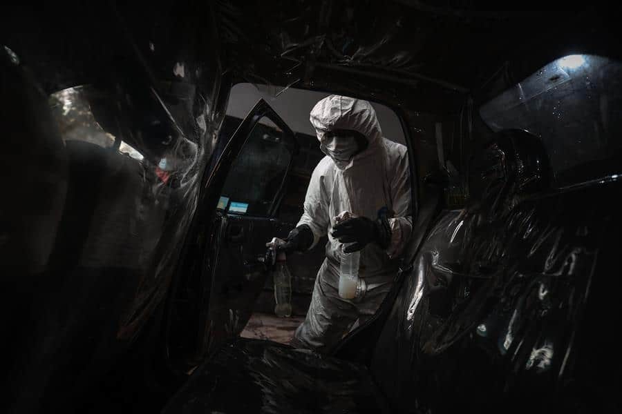 Luego del traslado, los vehículos pasan por una limpieza exhaustiva. En los lavaderos de autos, trabajadores cubiertos de la cabeza a los pies, con productos de limpieza y una manguera a chorro en mano, barren cualquier rastro de coronavirus.