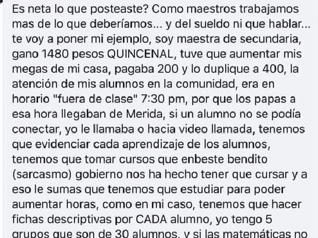 En los comentarios había personas a favor y en contra, otras más que trataba de explicar la situación, pero una maestra de secundaria explicó el tiempo y los gastos extras que tienen que invertir para atender a sus alumnos en la educación a distancia por la pandemia ante el Covid-19.