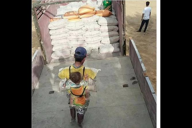 En las imágenes se le aprecia trabajando en una construcción. Incluso se ve cómo carga costales de cincuenta kilos mientras lleva al menor en su espalda.