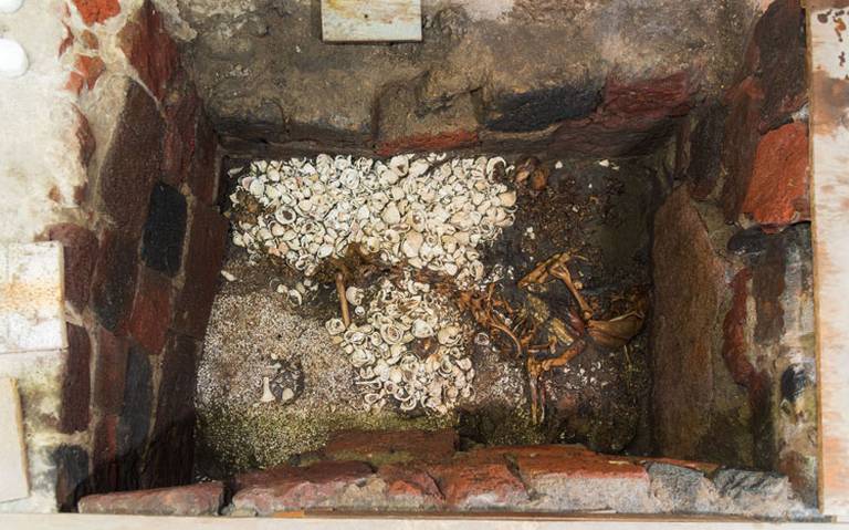 A sólo cinco metros de profundidad, justo debajo de la calle Guatemala en el Centro Histórico, yace el esqueleto de un jaguar rodeado de cientos de conchas y estrellas de mar que conforman la ofrenda 178 del Templo Mayor.
