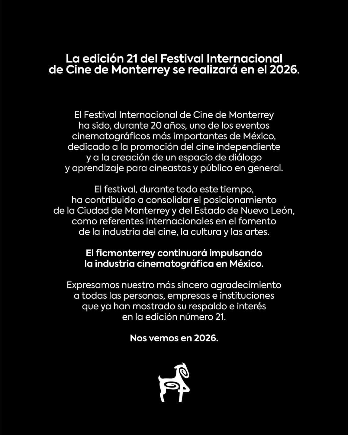 A pesar del anuncio de la no realización del festival en el presente año, los responsables del Festival Internacional de Cine de Monterrey han reafirmado su agradecimiento a todas las personas, empresas e instituciones que han manifestado su apoyo e interés en la edición número 21.