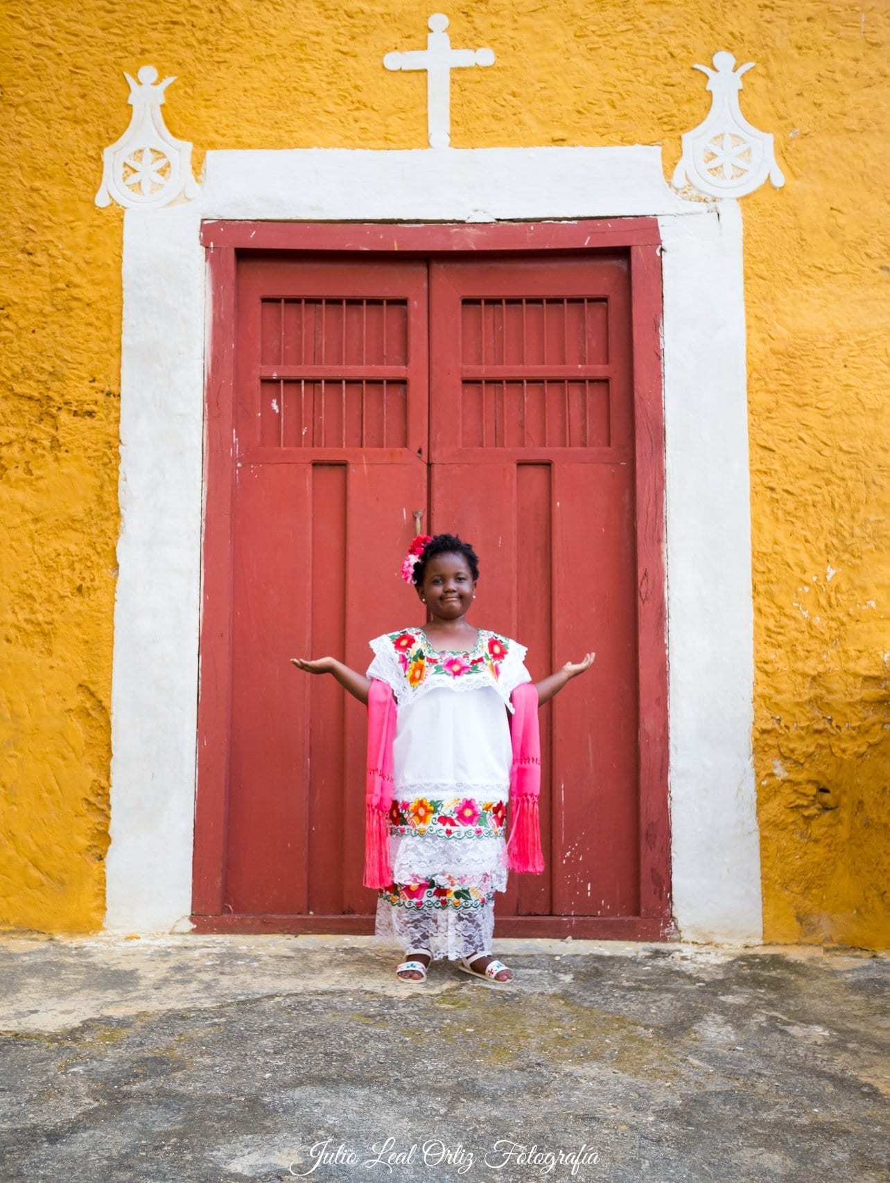 El fotografo o Julio Leal Ortiz logró capturar las mejores imágenes de la pequeña Taylor, que lució fabulosa con el traje típico de Yucatán, en el majestuoso escenario de Itzamal.