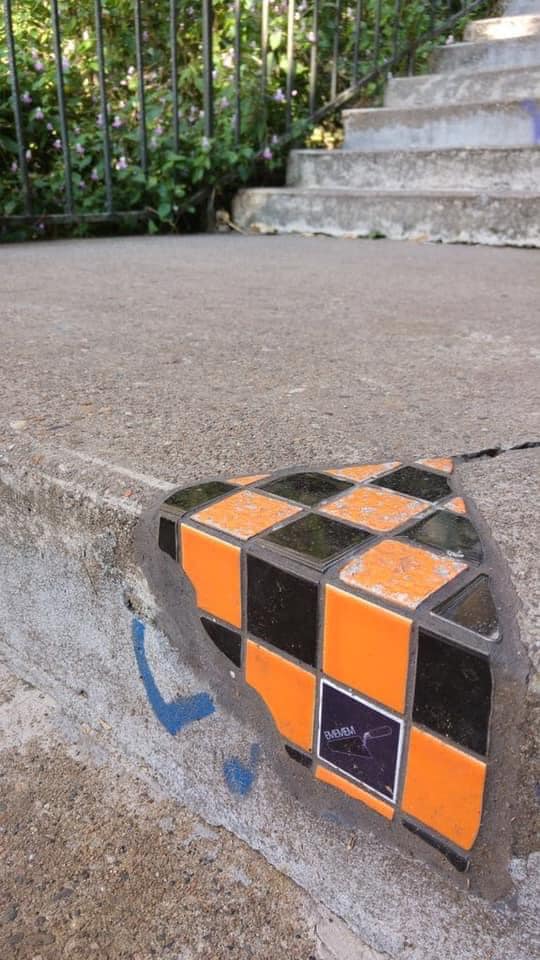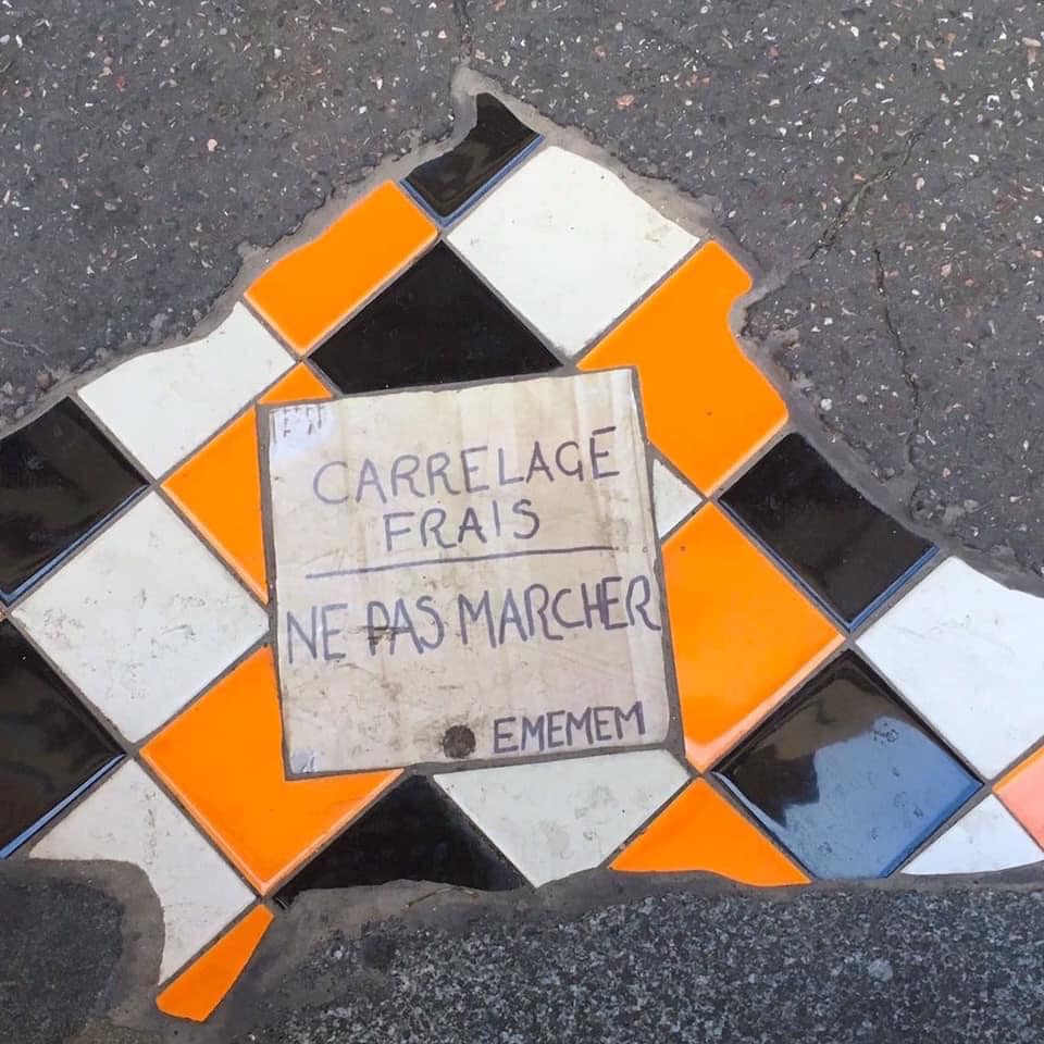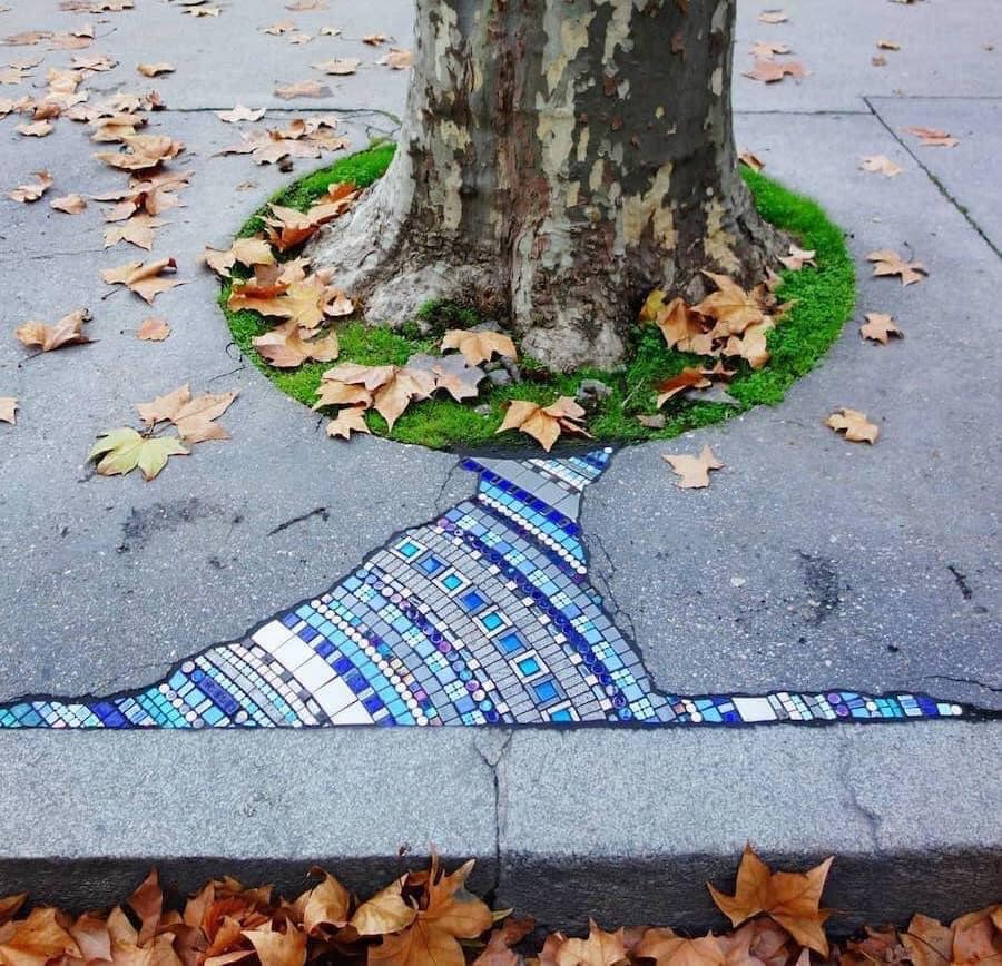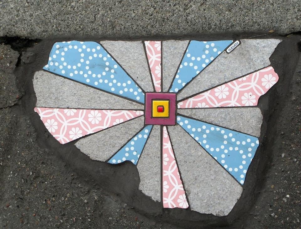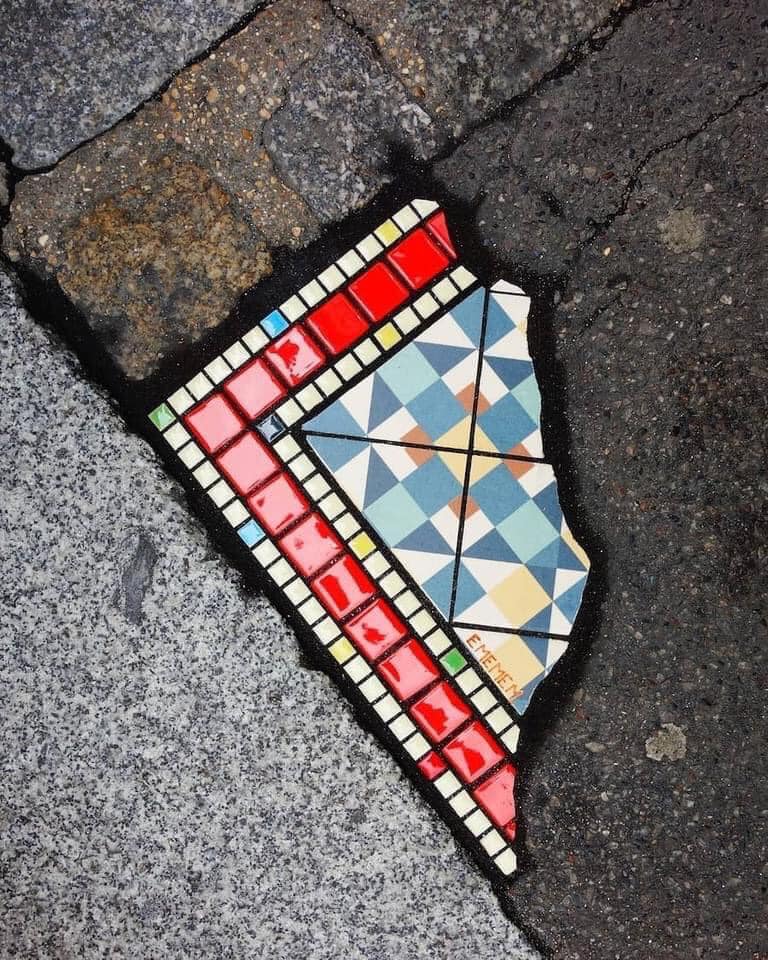 Desde 2016, Ememem llena los agujeros con mosaicos, a lo que llama “el arte de romper”. De hecho en Francia, lo llaman el “cirujano de acera”, por esta labor de tratar las “lesiones” de la calle.