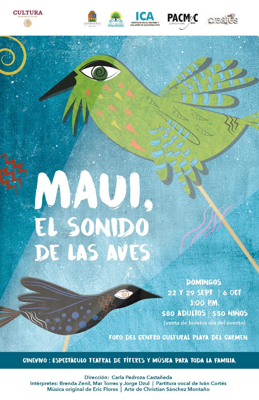 El próximo 22 de septiembre se estrena la puesta en escena MAUI, el sonido de las aves que consiste en un espectáculo realizado con títeres y música para toda la familia, dirigido por Carla Pedroza Castañeda que se presentará en Playa del Carmen.