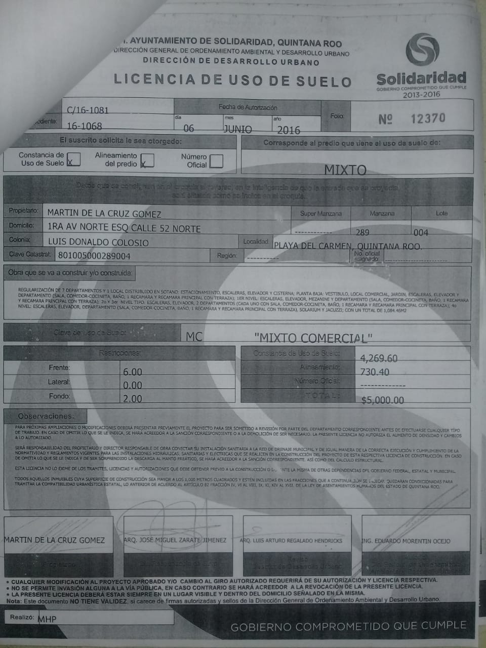 Y no sólo eso, por otros 5 mil pesos, le autorizaron la constancia de uso de suelo para destina su edificio a “Mixto Comercial”, como consta en la licencia de uso de suelo número 12370 de la misma dirección general de Ordenamiento Urbano.