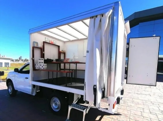 La Nissan NP300 en cuestión fue modificada con una caja en la parte posterior que cuenta con cortinas laterales, puerta trasera, escaleras retráctiles, conexiones eléctricas y sillas y mesas abatibles.
