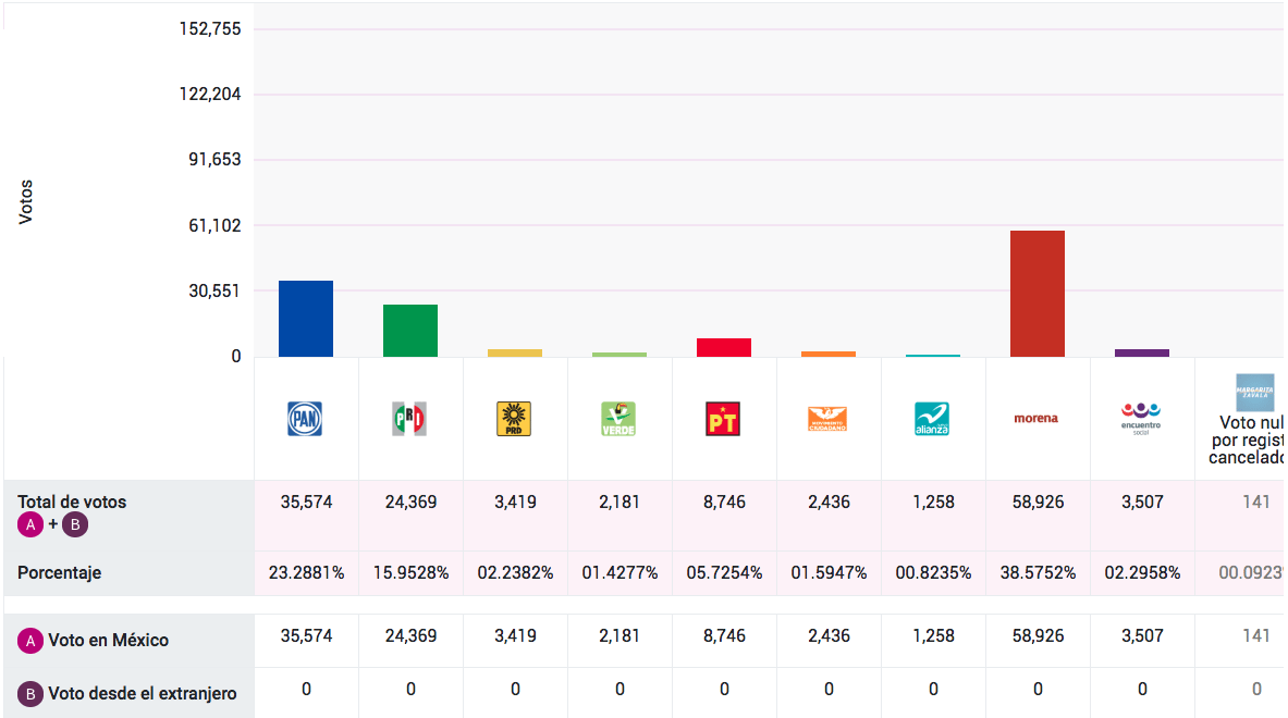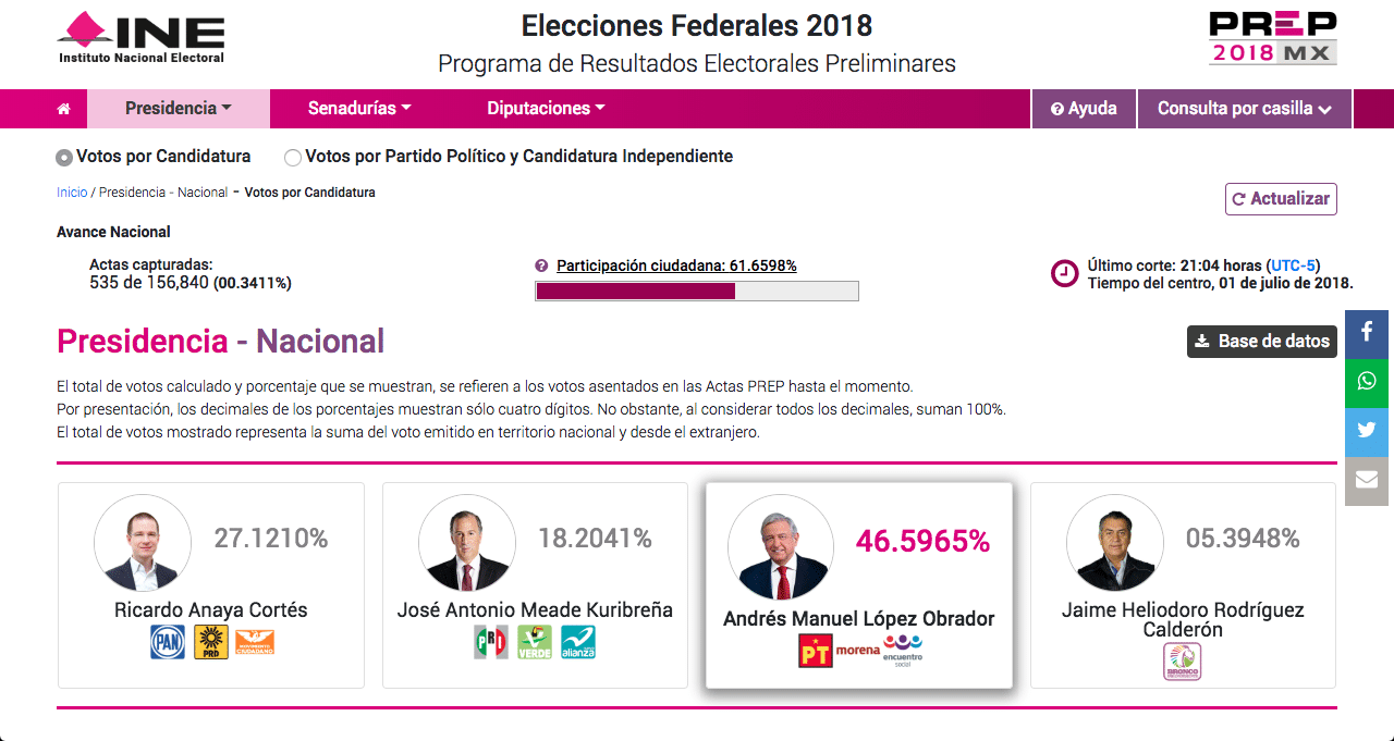 Según el Programa de Resultados Electorales Preliminares (PREP) del Instituto Nacional Electoral (INE), Andrés Manuel López Obrador ha aumentado su ventaja, con 46.5%.