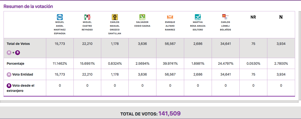 Mucho más abajo se encuentran Miguel Castro Reynoso (PRI) con 15.6% y Miguel Ángel Martínez Espinosa (PAN) con 11.1%.