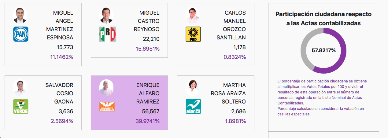 A diferencia de otras entidades, Movimiento Ciudadano (sin ninguna coalición) y su candidato Enrique Alfaro Ramírez, han asegurado el triunfo en la gubernatura, según el PREP de Jalisco.