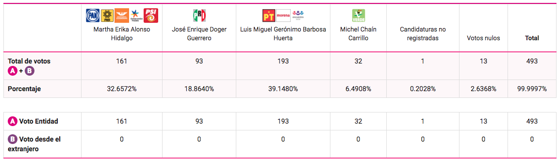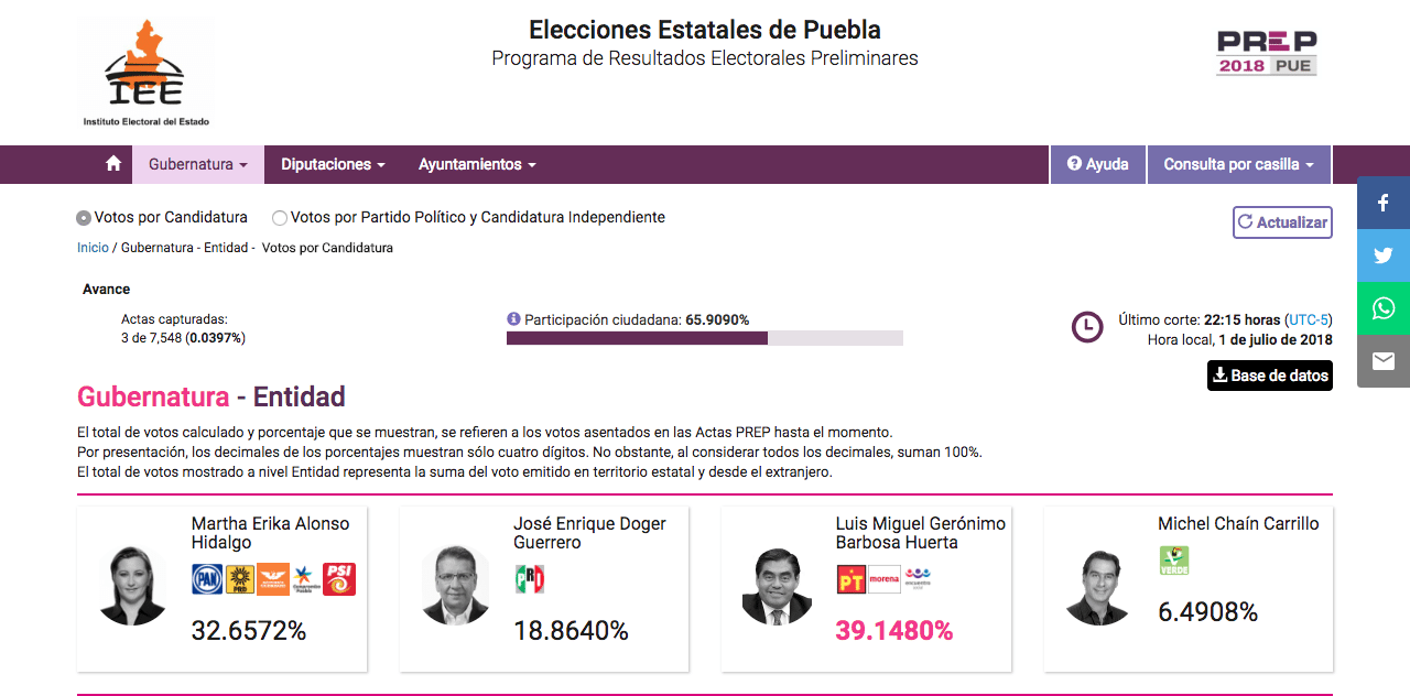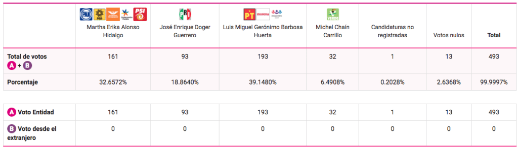 Luis Miguel Gerónimo Barbosa Huerta de la coalición Juntos Haremos Historia lidera estos resultados con 39.1%, mientras que Martha Erika Alonso Hidalgo (Por Puebla al Frente) acumula un 32.6%.