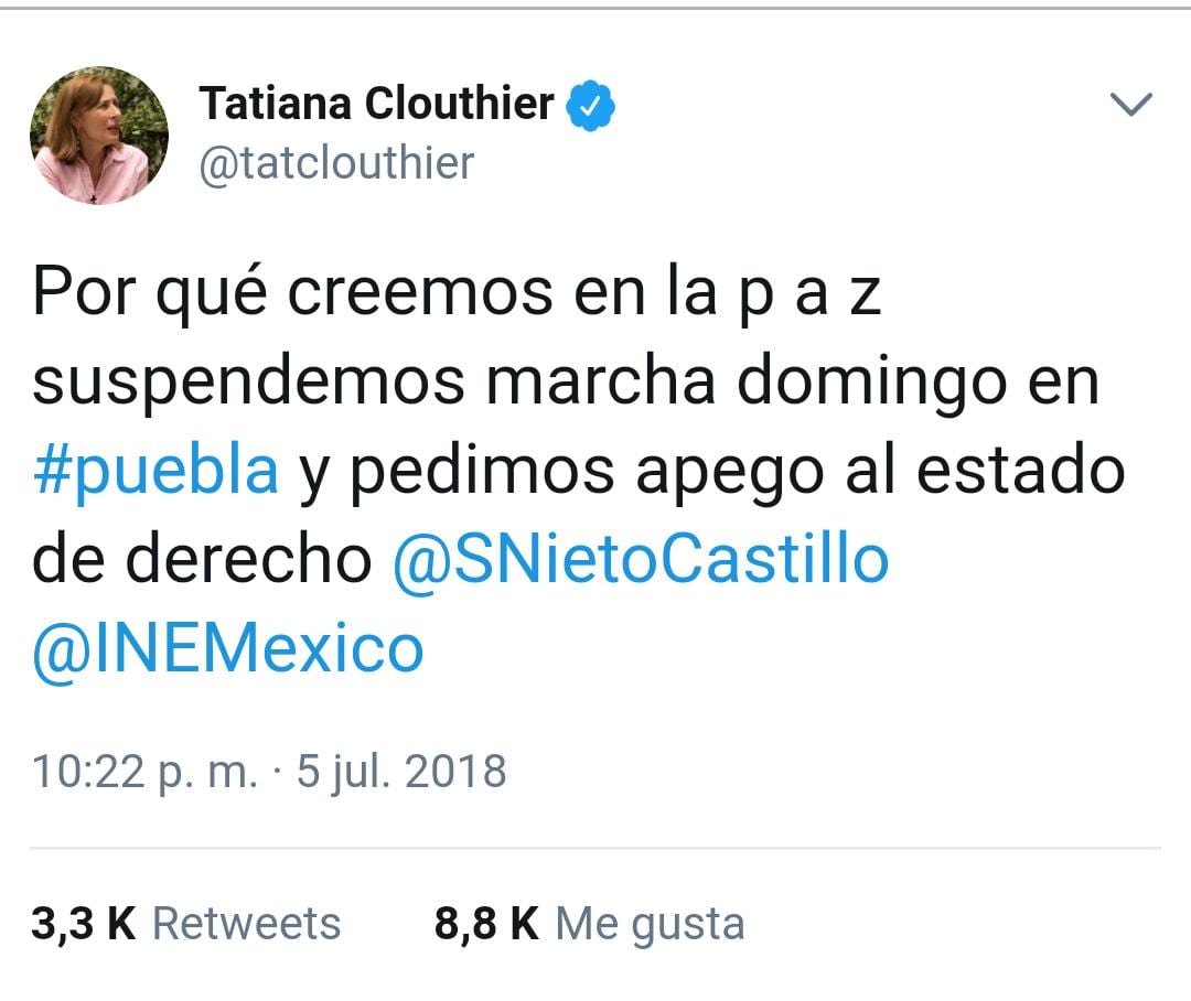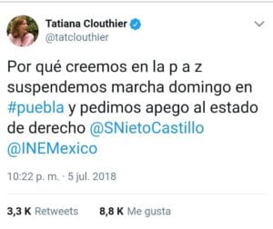 En contraparte, Tatiana Clouthier, coordinadora de la campaña de AMLO, anunció a través de su cuenta de Twitter la suspensión de la marcha del domingo en Puebla, la cual incitaba a la violencia.