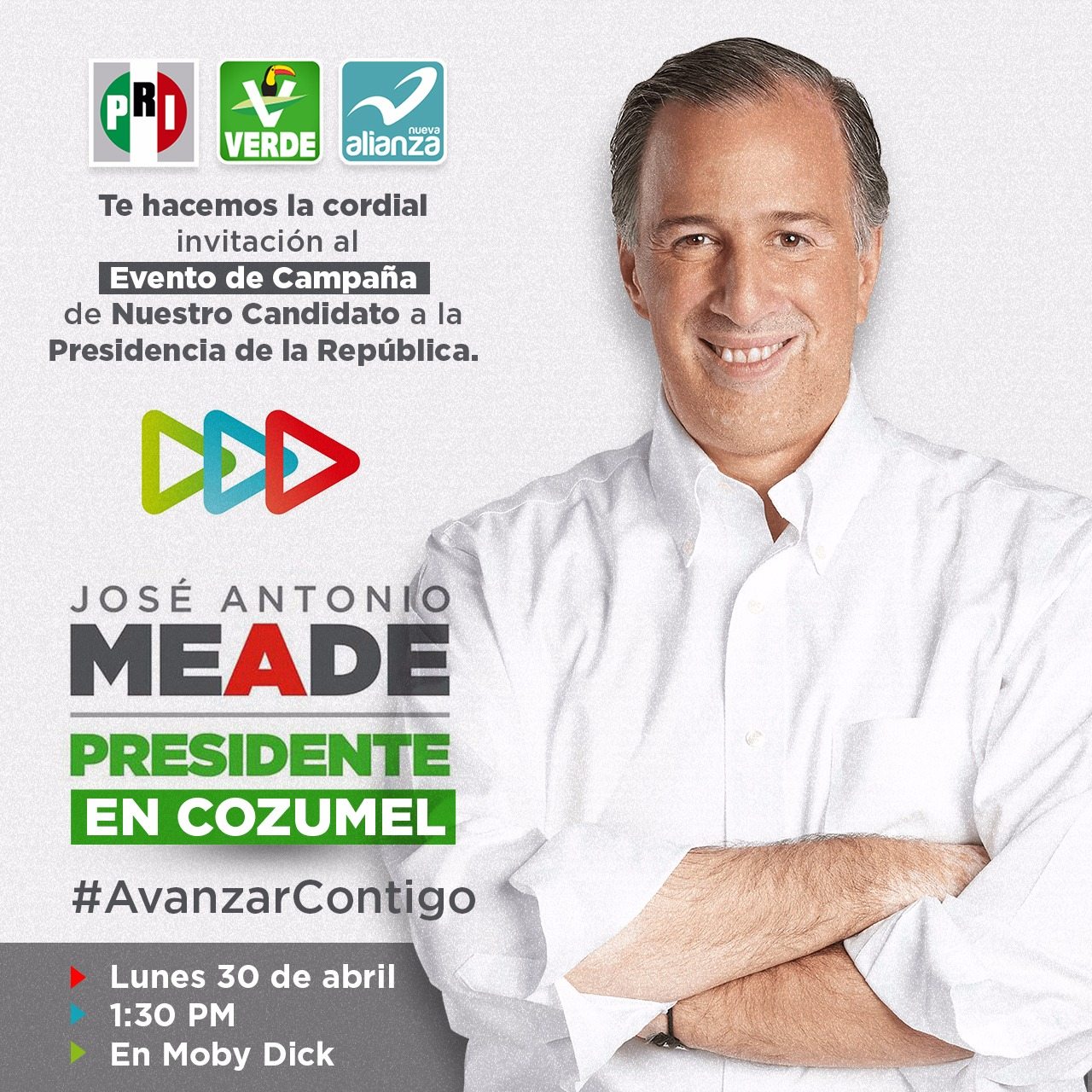 El lunes 30, el aspirante del PRI, PVEM y Nueva Alianza, José Antonio Meade, tiene previsto un encuentro público con la militancia y los candidatos, en Cozumel, a partir de las 13:30 horas en un lugar conocido como “Moby Dick”.