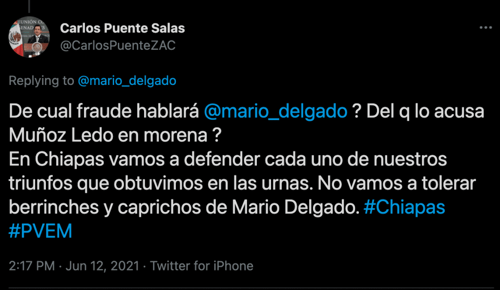 Horas más tarde del tuit de Mario Delgado, el diputado por Zacatecas del Partido Verde Ecologista de México, Carlos Alberto Puente Salas, rechazó las acusaciones del morenista y afirmó que su partido defenderá esa y otras elecciones en las que resultó vencedor.