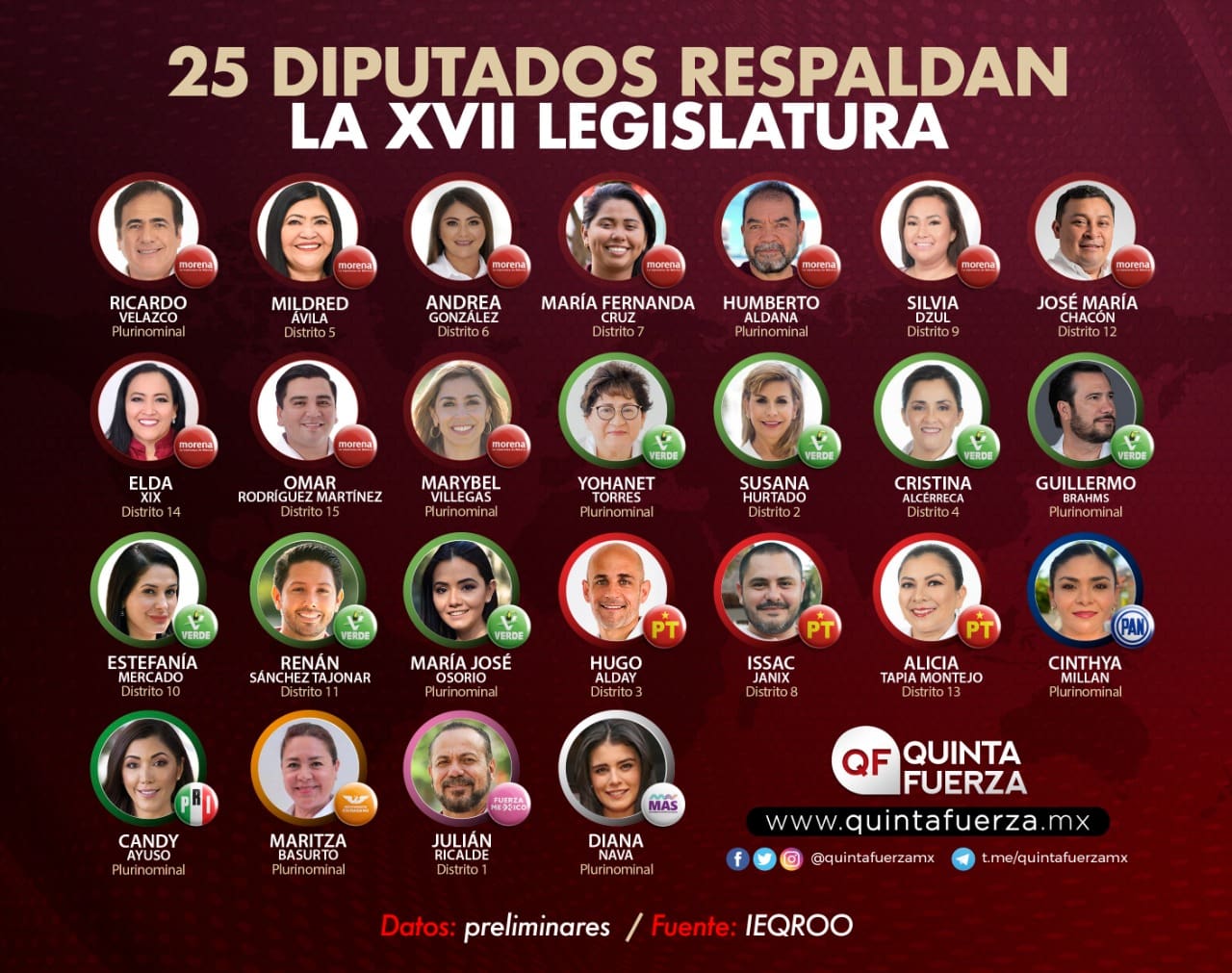 Del Partido Verde: Yohanet Torres Muñoz, María José Osorio Rosas y Guillermo Andres Brahms González. Del PAN solamente quedó como diputada Cinthia Millán Estrella y del PRI, partido que apenas antes de Carlos Joaquín dominaba la gubernatura, alcaldías y Congreso, Candelaria Ayuso Achach.