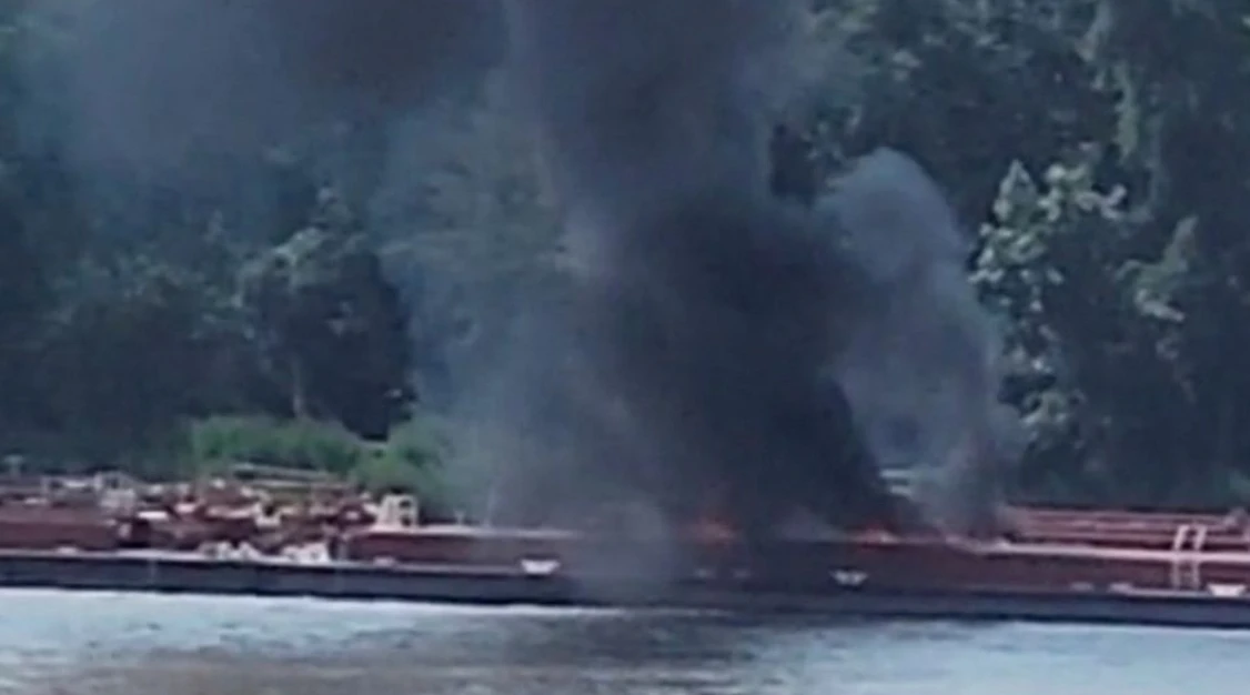 Un video difundido en redes sociales mostró una columna de humo negro elevándose desde una barcaza segundos después del impacto.