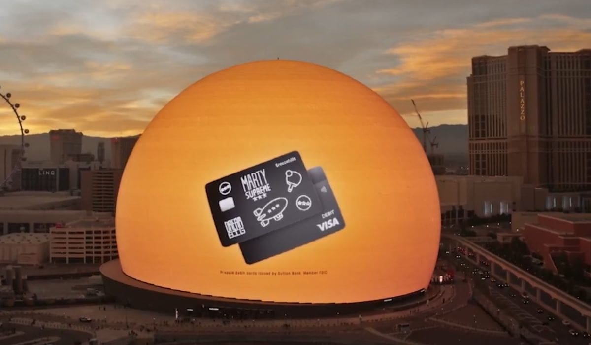 Instantes después, la cámara se abre para revelar la superficie completa de la Esfera de Las Vegas iluminada con un gigantesco anuncio de la película, que transforma la estructura en lo que parece una enorme pelota de ping-pong. Este guiño visual se conecta directamente con el universo del filme, en el que el deporte de la mesa se convierte en metáfora de ambición, fama y búsqueda de identidad personal.