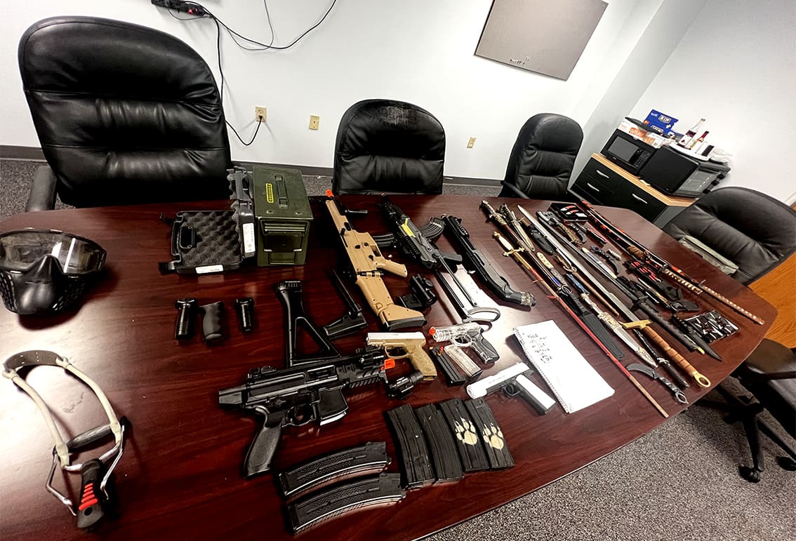 “Los oficiales confiscaron rifles y pistolas de airsoft (un deporte de simulación militar; se dispara con réplicas de armas que utilizan bolas de plástico), así como munición falsa. También cuchillos, espadas y otras armas que mostraba en video”, publicó el oficial en sus redes.